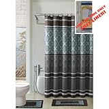 BROWN and BLUE 4-Piece Bathroom Set: 2-Rugs/Mats, 1-Fabric Shower Curtain, 12-Fabric Covered Rings PLUS FREE Clear Vinyl Liner!